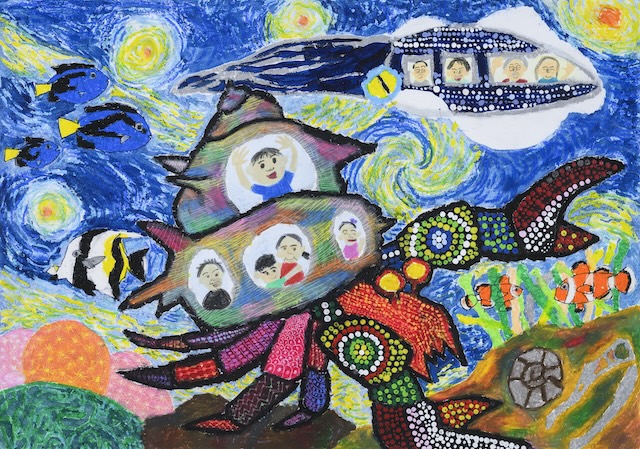 「海の世界や恐竜の世界、夏休みに見たゴッホの絵の中にも入ってみたかったので、未来で行けるようになるといいなと思って描きました。工夫したところは、背景に僕の好きなゴッホの絵を描いたところです。難しかったのは、ヤドカリの模様の点々。みんなの願いが叶うと思うとワクワクするし、未来が楽しみになりました」