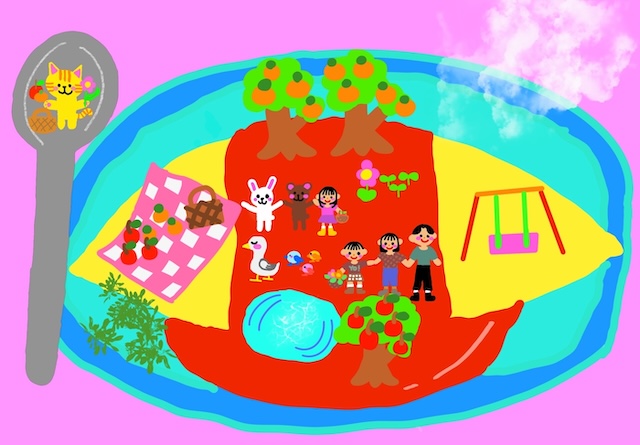 オムライスの上でピクニックをするという、子どもらしいユニークな発想と、カラフルな色使いが印象的な作品です。