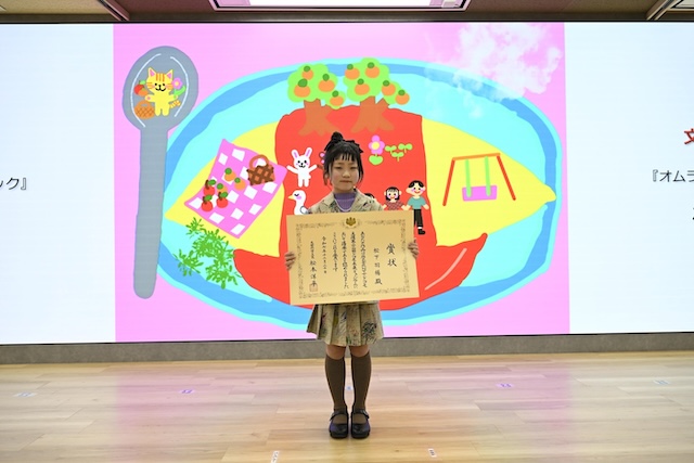 「自分の絵が選ばれてびっくりしました。そのあと、うれしい気持ちになって、みんなに話したくなりました。大好きなオムライスで、家族や動物たちと遊べたら楽しそうだなと思って描きました。いつかこの絵のように、食べ物の公園で遊んでみたいです」と、受賞の喜びを語ってくれました。